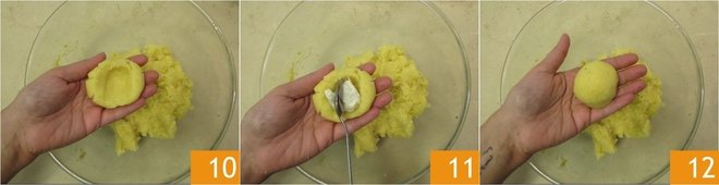 Take small portions of the mixture, about 1.75 oz each, and form balls by shaping them between the palms of your hands, then create a hollow in the center 10. Add a teaspoon of gorgonzola (about 0.25 oz) 11 and close the mixture to seal the filling inside 12. Continue this process to form all the patties; with these quantities you will get about ten.