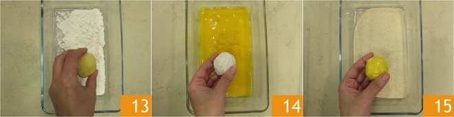 Proceed to the breading: pour the breadcrumbs and flour into 2 different bowls, then crack the eggs into a third bowl and beat them with a pinch of salt. Pass each patty first in the flour 13, then in the egg 14, and finally in the breadcrumbs 15. Repeat this operation to make a second breading.