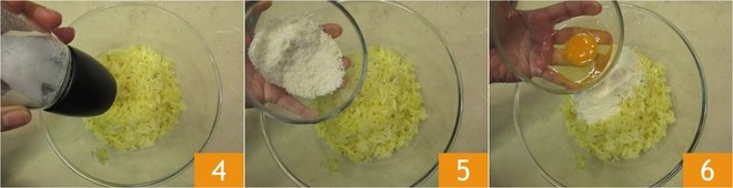 At this point, add a pinch of salt 4, grated Parmigiano Reggiano DOP 5, and an egg 6.