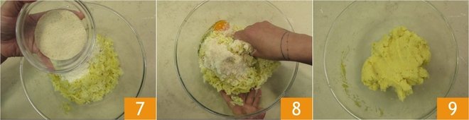 Also add the breadcrumbs 7 and mix first with a spoon and then with your hands 8 to obtain a compact mixture 9.