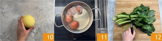 Once you have a smooth and uniform ball 10, cover it and let it rest for about 30 minutes at room temperature. Meanwhile, focus on the filling: place the washed potatoes with their skin in a pot of salted cold water and boil them for about half an hour 11; you can check the cooking with the prongs of a fork. Clean the herbs: remove the hardest and most fibrous part of the stem 12.