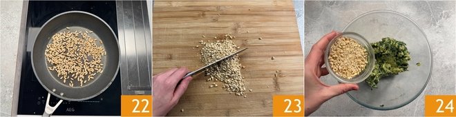 Toast the pine nuts in a pan 22, chop them 23 and add them to the filling 24.