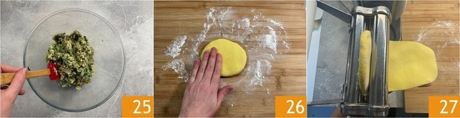 Finally, mix everything well 25. Retrieve the rested dough and separate a portion. Flatten it slightly on the floured work surface 26 then pass it through the sheet roller machine, starting from the thickest setting 27.