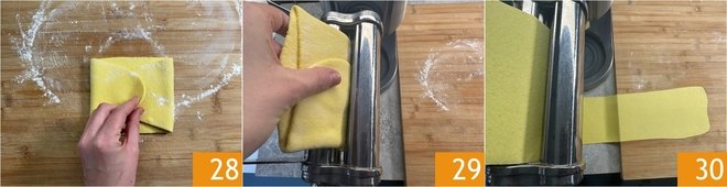 After this first pass, fold the dough over itself to make it rectangular 28 and pass it again through the roller at the same thickness 29. This will make the dough more resistant and the sheet shape more regular. Continue by passing it through the sheet roller machine, gradually reducing the thickness, until the penultimate setting 30.