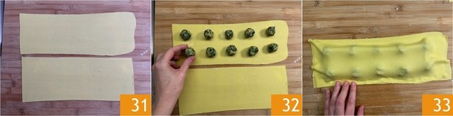 Then divide the sheet into 2 equal parts 31 and distribute balls of 0.25 oz (7 g) filling on one of the sheets, at a regular distance 32. Then cover with the other sheet 33, making sure the two layers stick well together and around the filling.