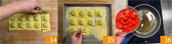With a fluted wheel, cut square ravioli 2.36 inches (6 cm) per side 34 and as they are made, arrange them without overlapping on a tray sprinkled with semolina 35. You can prepare the sauce: in a pan with a drizzle of oil and a garlic clove, pour the cherry tomatoes with their juice 36.