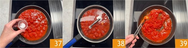 Salt 37, stir, cover with the lid 38 and let it cook for about 30 minutes. If needed, during the last 5 minutes remove the lid to let the sauce reduce better 38. Finally, remove the garlic 39.