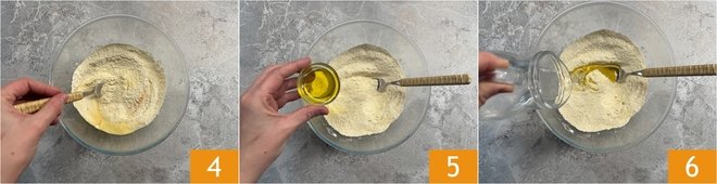 Mix with a fork 4 and add the oil 5 and water 6.