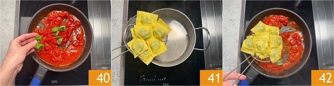 Fragrance with plenty of hand-torn basil 40 and plunge the ravioli into boiling salted water 41. Boil them for about 3 minutes and drain them directly into the sauce 42.