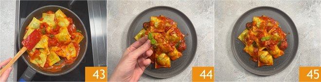 Gently mix them to coat without breaking 43. Plate with a few more basil leaves 44 and a grind of pepper. Your potato and herb ravioli with sauce are ready to be enjoyed 45!