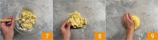 Continue working with the fork 7 to gather the ingredients, then transfer the dough to the work surface 8 and continue kneading by hand for a few minutes 9.