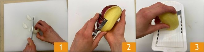 To prepare the potato and onion casserole, start with the onions. Peel them, cut them in half and then into slices 1. Peel the red potatoes 2 and cut them into slices 1/16-1/8 inch thick; for a thinner and more precise result, we recommend using a mandoline 3.