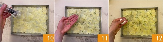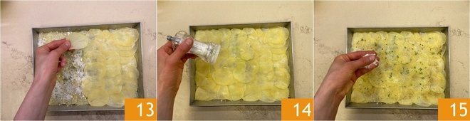 Add another layer of potatoes 13, season with salt 14, pepper, thyme, and sprinkle again with the cheese mix 15.