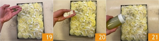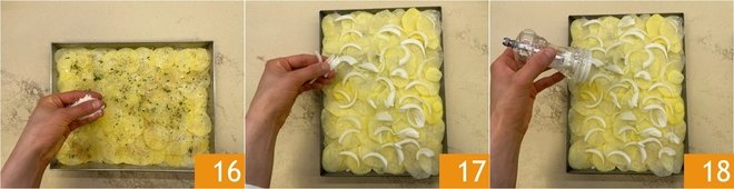 Proceed in this way to get a total of 4 layers of potatoes. Always season each layer with salt, pepper, thyme, and the cheese mix 16. After arranging the last layer of potatoes, add the onions on top 17. Salt 18 and pepper.