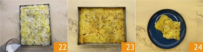 Pour the milk into the 4 corners of the baking dish very slowly, being careful not to let it overflow 22. This will help make the preparation more moist. Bake in a preheated static oven at 430°F for 30 minutes. When it is well golden, take it out of the oven 23, let it cool slightly and serve your potato and onion casserole 24!