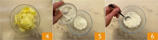 Proceed this way until you finish the potatoes 4. In a bowl, combine Pecorino and Parmesan 5, then mix with a spoon 6.