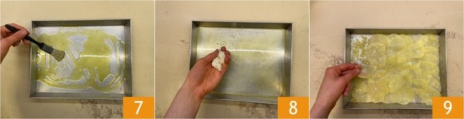 Grease a 12x9 inch baking dish 7 and sprinkle with grated cheese 8. Arrange the potato slices, slightly overlapping them 9.