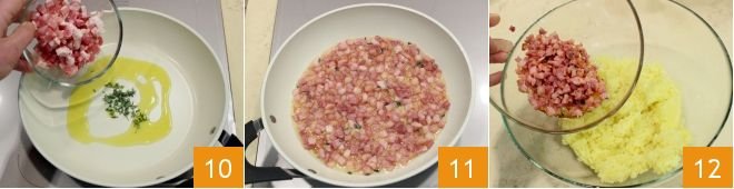 finally add the smoked bacon cubes 10. Sauté the bacon for about 7-8 minutes to make it crispy 11 and then mix the cubes into the mashed potatoes 12,