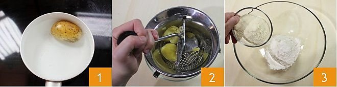 To prepare the potato beer focaccias, first boil the potato in plenty of water 1. When it is very tender, peel it and mash it with a potato masher 2. In a bowl, mix the semolina flour and all-purpose flour 3.