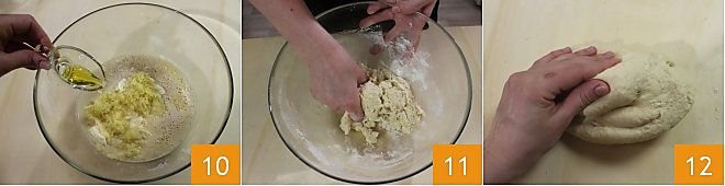 finally the oil 10. Knead with your hands, gathering all the ingredients 11 then transfer the dough to the pastry board and continue kneading until you get a smooth and firm dough 12. If you have a stand mixer, you can knead first with the paddle at medium speed to gather the ingredients, and then with the hook for 10 minutes at medium speed.