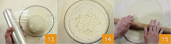 Place the dough in a bowl and cover with plastic wrap 13. Let it rise for 2 hours at room temperature, or in a warm environment, until the dough has doubled its initial volume and is well risen 14. Roll out on a well-floured board a sheet about 0.39 inches high 15 and