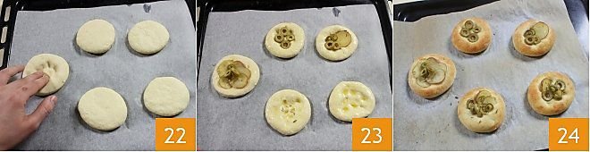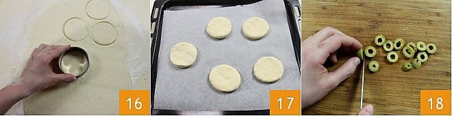 using a pastry cutter with a diameter of 3.35 inches, cut out the focaccias 16. Place them on a baking tray lined with parchment paper and let them rise for another hour 17. Meanwhile, cut the olives into rings 18 and