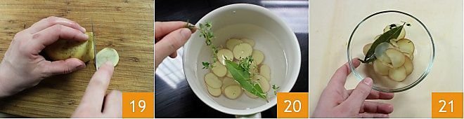 thinly slice the well-washed but unpeeled potatoes 19. Cook the potatoes for about 10 minutes in plenty of salted water, flavoring it with thyme and bay leaf 20. When the potatoes are very tender, drain them 21.