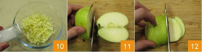 Place the cabbage in a bowl, salt it 10, and let it rest for about 30 minutes so it will become softer and release its liquids. Meanwhile, wash and dry the apples, cut them in half 11 and then into thin slices 12;