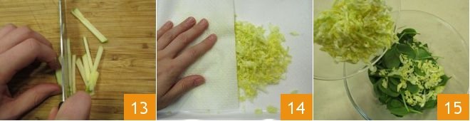 slice each piece into strips 13 and set aside. Now dry the cabbage with a cloth 14. Everything is ready to assemble the salad: in a bowl, pour in the washed and dried baby spinach, add the cabbage 15,