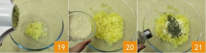 Once the potatoes are ready, put them hot and unpeeled in a potato masher, collecting the puree in a large bowl 19. Add the grated cheese 20, the chopped herbs, salt, and pepper 21.
