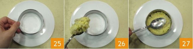 Place a round pastry cutter with a diameter of 4 inches in the center of the sheet 25, insert the mixture inside the cutter 26, and press it well with the back of a spoon 27.