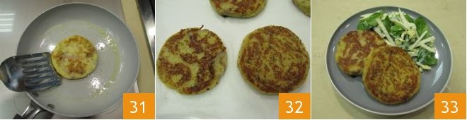 Cook the burgers for 3 minutes on one side and 2 minutes on the other 31, they should be golden on the surface 32. Serve the hot potato burgers immediately, accompanied by the yogurt salad 33.