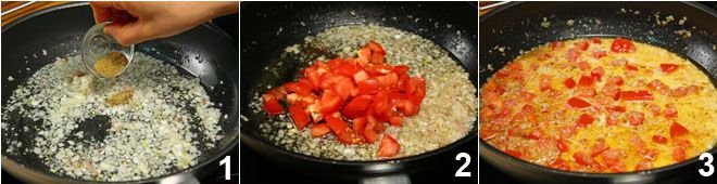 Prepare the sauce: finely chop shallots and garlic, heat oil in a pan and sauté until golden, add the cumin and let the aromas release 1; add the tomato 2 cut into chunks and deseeded, cook for a couple of minutes over low heat.