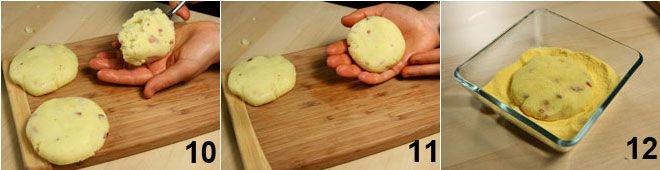 take a tablespoon of the mixture at a time 10 and form flat cakes with the help of your hands 11, coat them well in cornmeal 12 so they remain crispy when cooked.