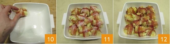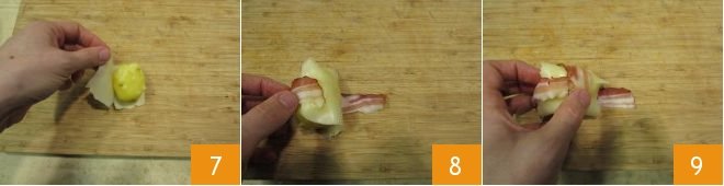 As soon as the potatoes are cold, take one and wrap a slice of cheese around it 7. Then take one of the bacon slices and use it to secure the cheese 8. Place another slice of bacon along the other side to form a cross 9.