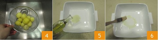 Once cooked, drain the potatoes 4 and let them cool. Meanwhile, pour some oil into a baking dish 5 and use a brush to grease the entire surface 6.