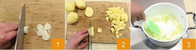 To prepare the potato cream with cuttlefish, start with the cream: make the Vegetable broth with celery, carrot, and onion. Thinly slice the leek 1, peel the potatoes and cut them into cubes 2. Heat a drizzle of olive oil in a pan and gently soften the leek over low heat for 10-15 minutes 3,