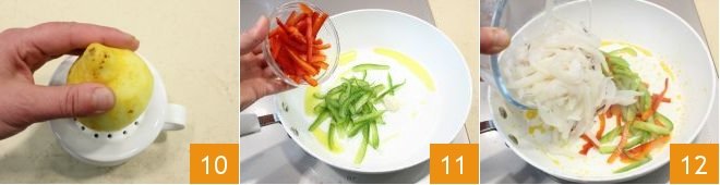 squeeze the juice from half 10. In a large pan, sauté the garlic clove to flavor the oil, add the peppers 11, and just soften them for a few minutes; they should remain crunchy. Remove the garlic clove with tongs and add the cuttlefish 12.