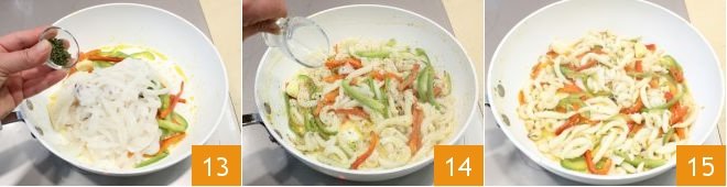 Flavor with thyme 13, with the lemon zest and juice 14, and stir with a spoon. Add salt and pepper and cook for a few minutes. Then turn off the heat 15.