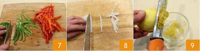 Remove the stem from the peppers and take out the seeds, then cut them into thin strips 7. Take the cuttlefish and cut them into strips about 1/4 inch wide 8. If you bought cuttlefish that need cleaning, you will need to gut them and rinse them under running water. Grate the lemon zest 9