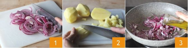 To prepare the potato crepes, first clean the onion and slice it thinly 1. Peel the potatoes and cut them into cubes 2. In a pan, add the onions and a drizzle of olive oil 3, let them brown for 5 minutes over low heat.