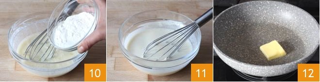 Mix well with a whisk and then slowly add the remaining flour 10, stirring until you get a smooth batter 11. Adjust the amount of flour based on the batter's consistency. In a 20 cm (8-inch) diameter pan, melt a pat of butter 12,