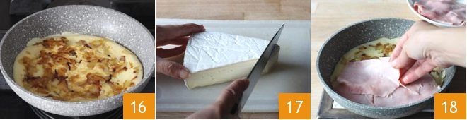 Cook for about 2 minutes and then turn off the heat 16. Cut the brie into slices 17 and fill the crepe with a few slices of cooked ham 18