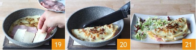 and the brie 19. Fold the crepe over the filling 20. Transfer the crepe to a plate and continue with the remaining batter, remembering to always grease with some butter for subsequent cooking. Serve the potato crepes with brie and ham hot, accompanied by fresh salad 21.
