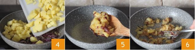 When the onion is soft, add the cubed potatoes 4, salt, and continue cooking for 10 minutes over high heat. As soon as the potatoes are soft 5, turn off the heat and slightly mash the potatoes with a fork 6.