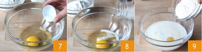 In the meantime, crack the egg into a bowl, add a pinch of salt 7, the milk 8, and half of the flour 9.