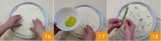 gently stretch it into a disk, then finish stretching the dough inside the pan, spreading it evenly over the entire surface; make small holes with a light pressure of your fingers 16. Then season the potato focaccia with an emulsion of water and oil and rosemary (17-18).