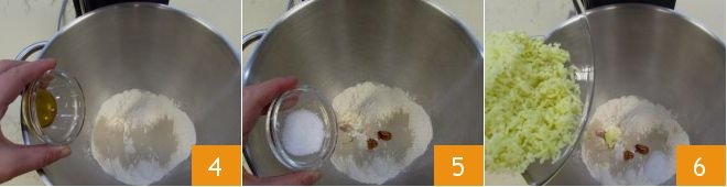 meanwhile, in the bowl of a stand mixer, pour the sifted flour, the dry yeast, and the malt 4, then also add the salt around the edges 5 and the now cooled potatoes 6. You can also use fresh brewer's yeast: in this case, the dose to use is 21 g. The malt can be substituted with the same amount of honey.