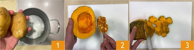 To prepare the potato gateau with pumpkin and taleggio, start with the potatoes: rinse them and place them in a large pot, covering with plenty of cold water 1. Bring to a boil and cook for about 30-40 minutes, depending on the size of the potatoes. While the potatoes are cooking, take care of the pumpkin: remove the seeds and internal strings with a spoon 2, then remove the outer skin 3.