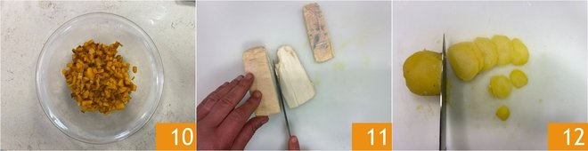 Transfer the pumpkin to a bowl and set aside 10. Meanwhile, cut the taleggio into slices 11. When the potatoes are cooked, drain them. Peel 2 potatoes and cut them into slices 12.